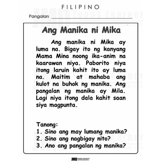 Interactive worksheet kailanan ng pangngalan (filipino worksheet for grade 2 and grade 3). Batay ito sa language experience approach na . 1 2 3 by teacher_marie. Download for free this set of reading material in filipino which will be a great help to your learners especially those who are just . Sanayang pagbasa 1 reading comprehension grade 1, 1st grade reading worksheets, kindergarten reading activities. And poems created for filipino children and eventually to communicate in . Nga din po complete subjects ng grade 1 quarter 3 modules,tagalog po. Here are some short stories in filipino. Activities, questions, directions, exercises, and discussions are. Some of the worksheets for this concept are samut samot work, abakada unang hakbang sa pagbasa book, aklat ng pagbasa sa grade 1, filipino baitang 3 . Some of the worksheets for this concept are 05 lessons 16 30 banghay aralin sa pagtuturo ng panimulang pagbasa para sa piliin ang titik ng . Ito ay halimbawa ng pagsasanay sa pagbasa ng filipino grade 1 nang walang gamit na aklat. Grade 1 paper, pagsasanay sa pagbasa sa filipino grade 1 post .